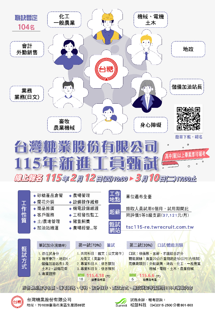 轉知「台灣糖業股份有限公司 115 年新進工員甄試」簡章暨甄試招考訊息